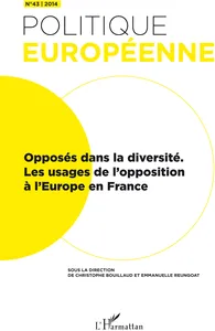 Opposés dans la diversité. Les usages de l’opposition à l’Europe en France n° 43, 2014/1 - pagesPages 9 à 45Tous des opposants ?Par Christophe Bouillaud, Emmanuelle ReungoatPages 46 à 67Européanisation et dynamique de changement partisanPar Nicolas AzamPages 68 à 92Le sens et le rôle de la résistance à l'UE pour le Parti de gauchePar Fabien Escalona, Mathieu VieiraPages 94 à 119S'opposer à quel prix ?Par Martin BalogePages 120 à 162Mobiliser l'Europe dans la compétition nationalePar Emmanuelle ReungoatPages 164 à 190« L'Action française contre l'Europe »Par Humberto CucchettiPages 192 à 209Le Parlement européen, une courroie de transmission pour des opposants nationaux à la Commission européenne. L'opposition à la libéralisation des droits de plantation viticolesPar Romain BlancaneauxPages 210 à 241Comment peut-on militer à Bruxelles pour une « Autre Europe » ?Par Laurence JourdainPages 245 à 253Le Fonds social européen à l'épreuve des régions en voie de désindustrialisationPar Fanny Sbaraglia
